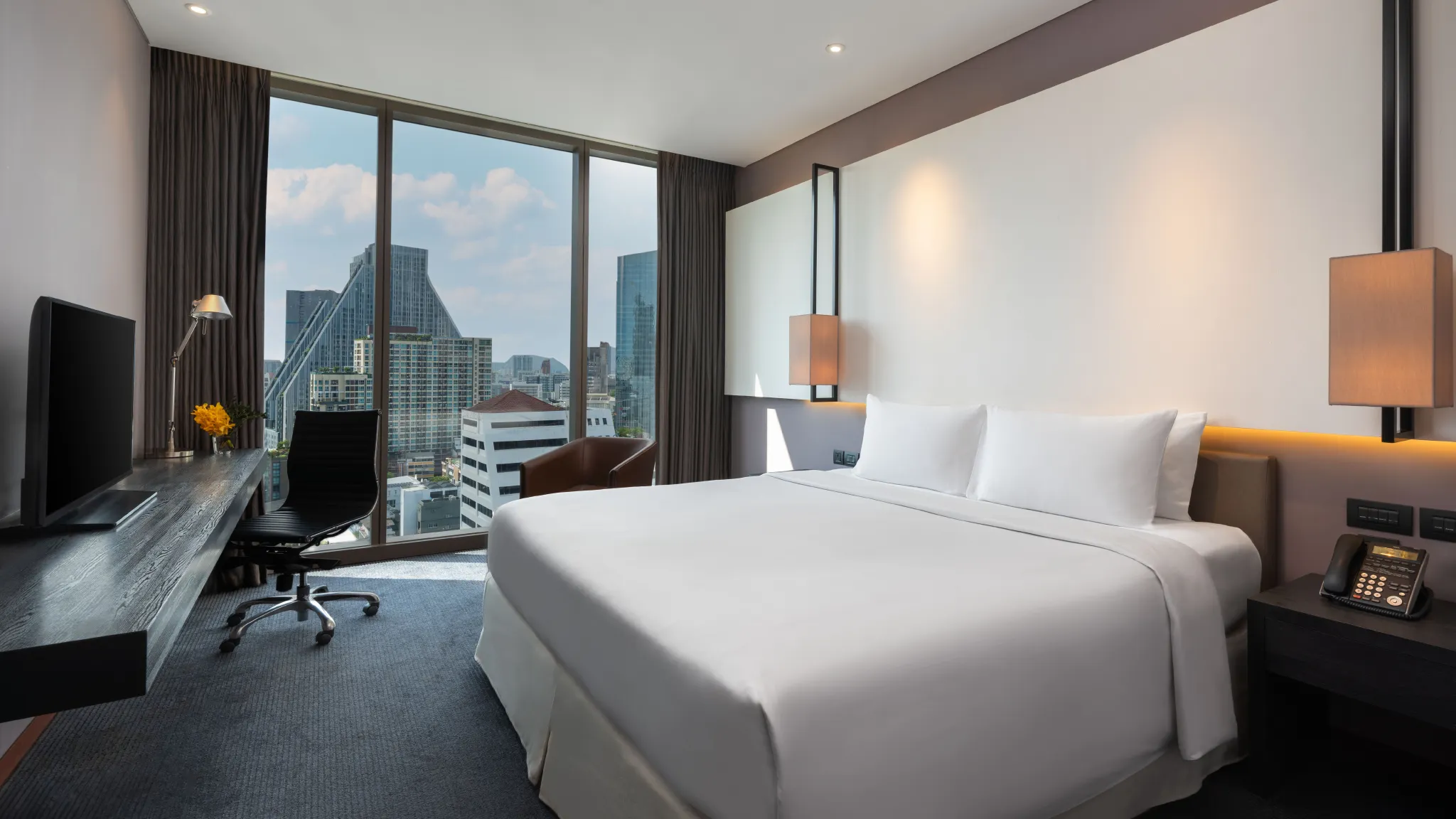 Unsere eleganten Executive-Zimmer sind auf höchsten Komfort ausgelegt und bieten Ihnen einen persönlichen Raum, in dem Sie bequem arbeiten können. Sie befinden sich in einer höheren Etage und bieten einen spektakulären Blick auf die Stadt Bangkok. Damit sind sie ideal für moderne Geschäftsreisende.